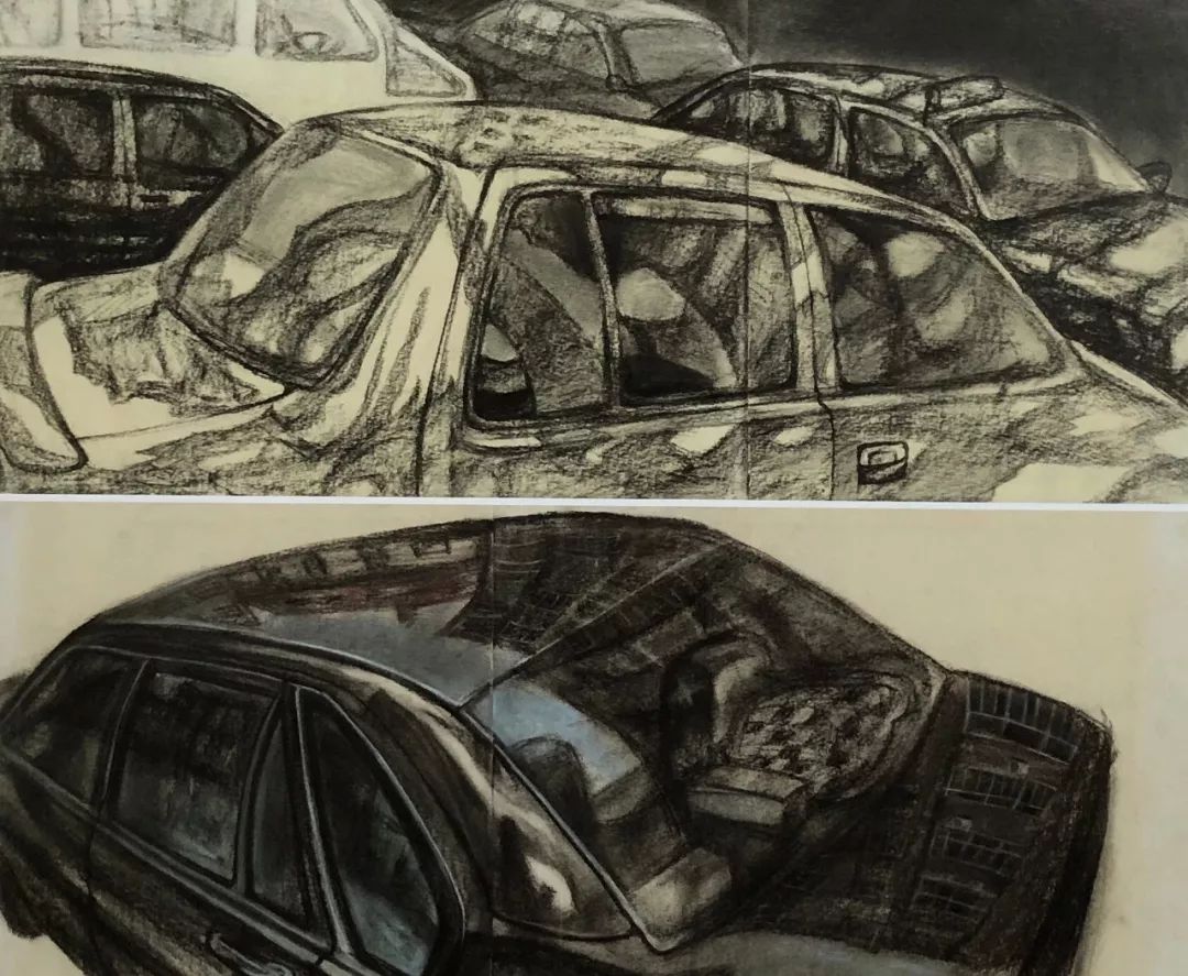 城市一瞥·车 王礼军 纸本炭笔 26cm×64cm×2 2000年