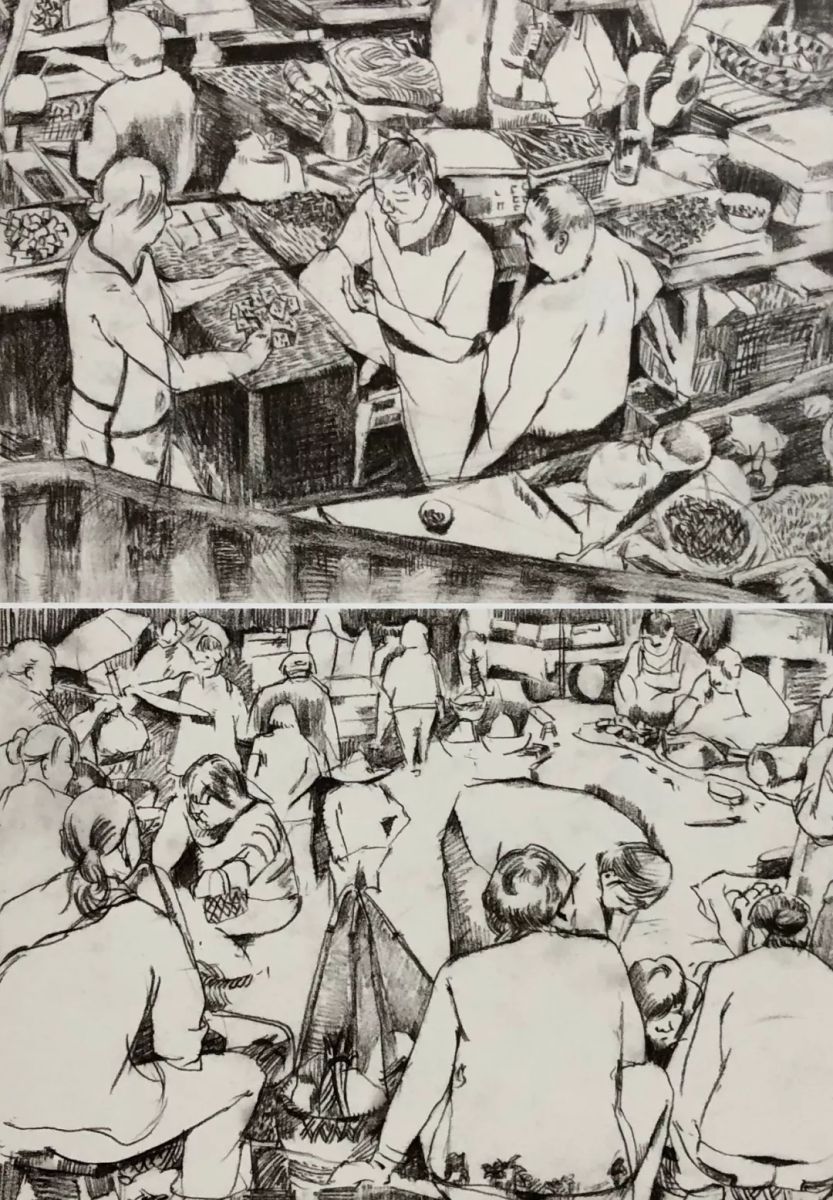 歙县菜场之一 陈毅胜 纸本炭笔 20cm×25cm×2 2014年